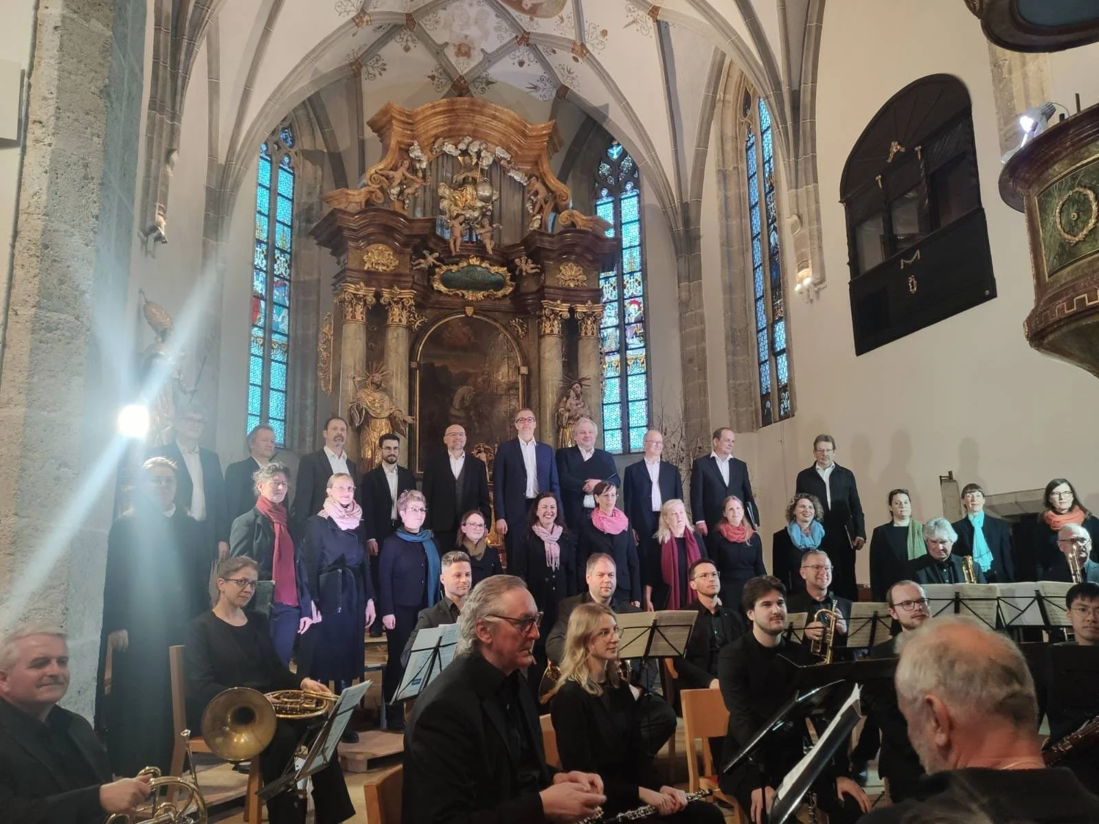 Bei den Festspielen „Europäische Wochen Passau“ 2024 erlebte unsere Erfolgsgeschichte von 6 Aufführungen in Folge mit Frank Martins doppelchöriger Messe a capella und Anton Bruckners Messe in e für Doppelchor mit Harmoniebegleitung an einem Abend (je ein „Achttausender“ des 19. und 20. Jahrhunderts!) einen weiteren Höhepunkt: In der prächtigen Stiftskirche Engelszell hatten wir zusammen mit dem Anton Bruckner Bläser Consort unseren bisher prominentesten Auftritt. Wir wurden eingeladen zusammen mit Künstlern wie Herbert Blomstedt mit den Bamberger Symphonikern, Kent Nagano mit dem Symphonieorchester des Bayrischen Rundfunks und Elina Garanča, Gidon Kremer und vielen anderen.